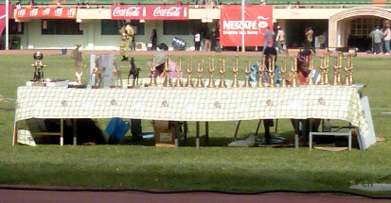 Stade du IV août, le lendemain, cérémonie de clôture en présence du Chef de l’État venu compter ses troupes. Cérémonial, décorum et musique omniprésente. Un jour peut-être, un organisateur admirateur de Versailles, installera les grandes eaux sur la pelouse du stade, on n’en n’est pas loin. Les tribunes officielles à l’ombre, sont blindées, les autres au soleil, vides...