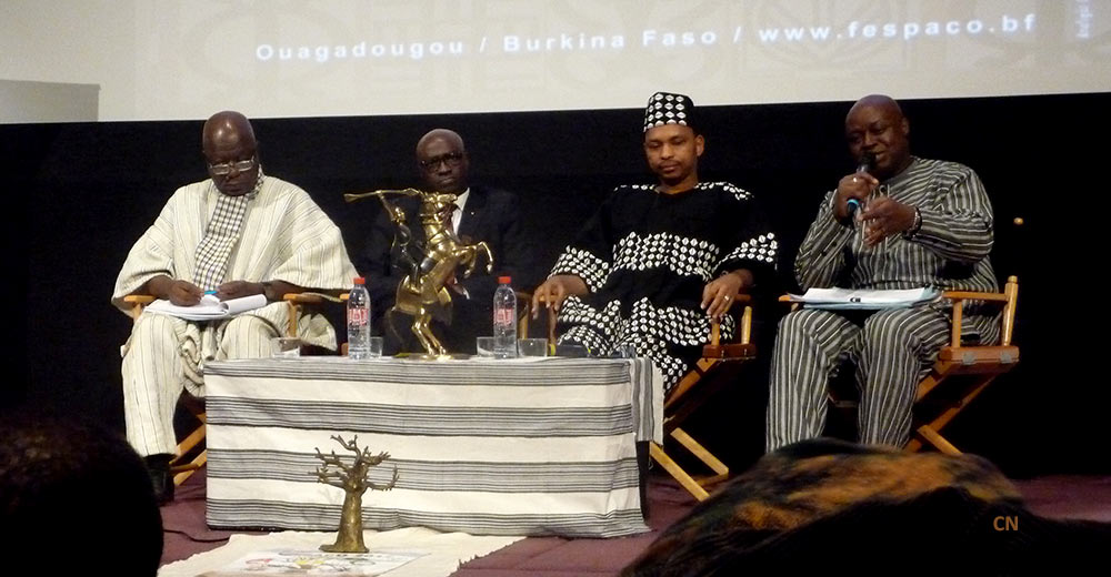 Le présidium de la conférence était composé (de gauche à droite sur la photo) du Président du comité d’organisation, Stanislas Méda, de l’Ambassadeur du Burkina Faso en France, Alain Gustave Francis Ilboudo, du ministre de la Culture, des Arts et du Tourisme burkinabé, Tahirou Barry ainsi que du délégué général du Fespaco, Ardiouma Soma.